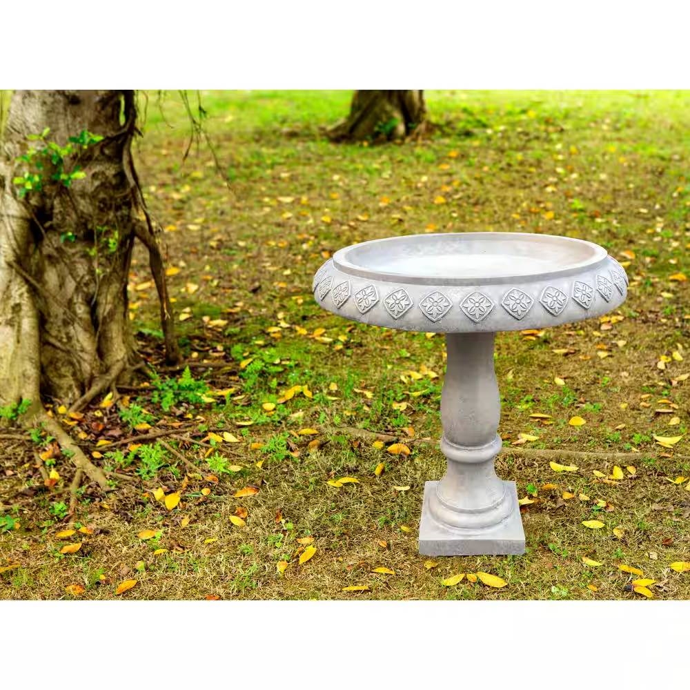 This Lightweight Weathered Concrete Fiberglass Stone Birdbath - 22-inch Diameter with a flower encased in a diamond pattern that is engraved along the rim of the bowl is a timeless piece that is pleasing to the eye and that will draw attention to your garden. A shallow and wide bowl assures that multiple small birds can drink and bathe safely at the same time. Bird bath holding water or feed can help to attract birds to stay in your yard, bird will help to aerate soil for more water and nutrients and beautify your garden lawn. Made of concrete and weather-resistant fiberglass that have all the advantages of these materials, such as strength, durability, weather and damage resistance, and long-lasting color.